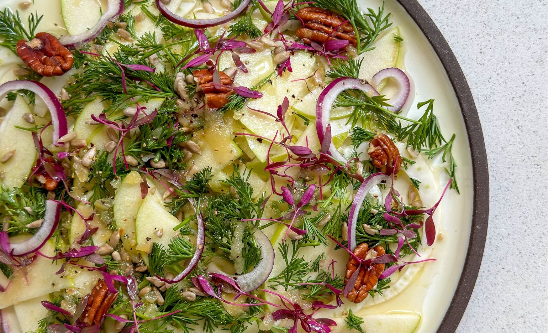 יוצקים מעל הסלט, מערבבים בעדינות ומקשטים בשברי פקאן, גרעיני חמנייה ועלים טריים.