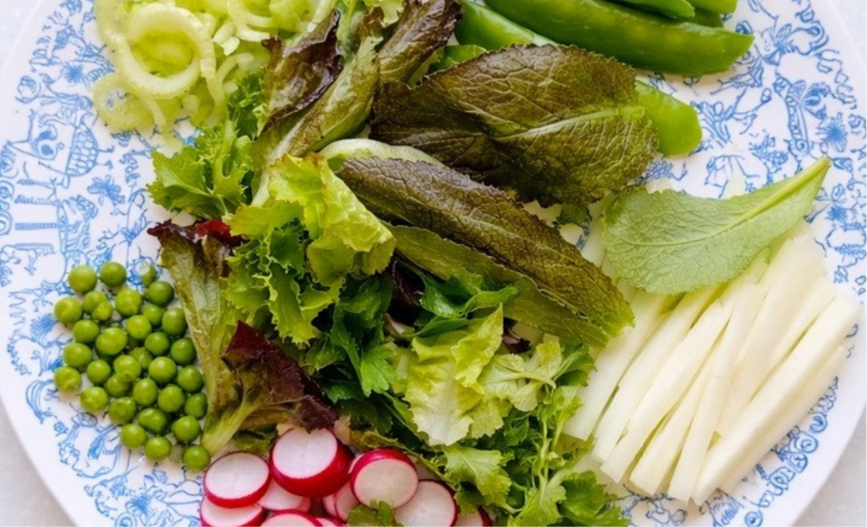 - מניחים בקערה גדולה את כל הירקות והעלים: אפונת הגינה, אפונת השלג, סלרי, קולורבי, פיצנונית ופיצלפת, מיקס החסות ועלי החרדל.