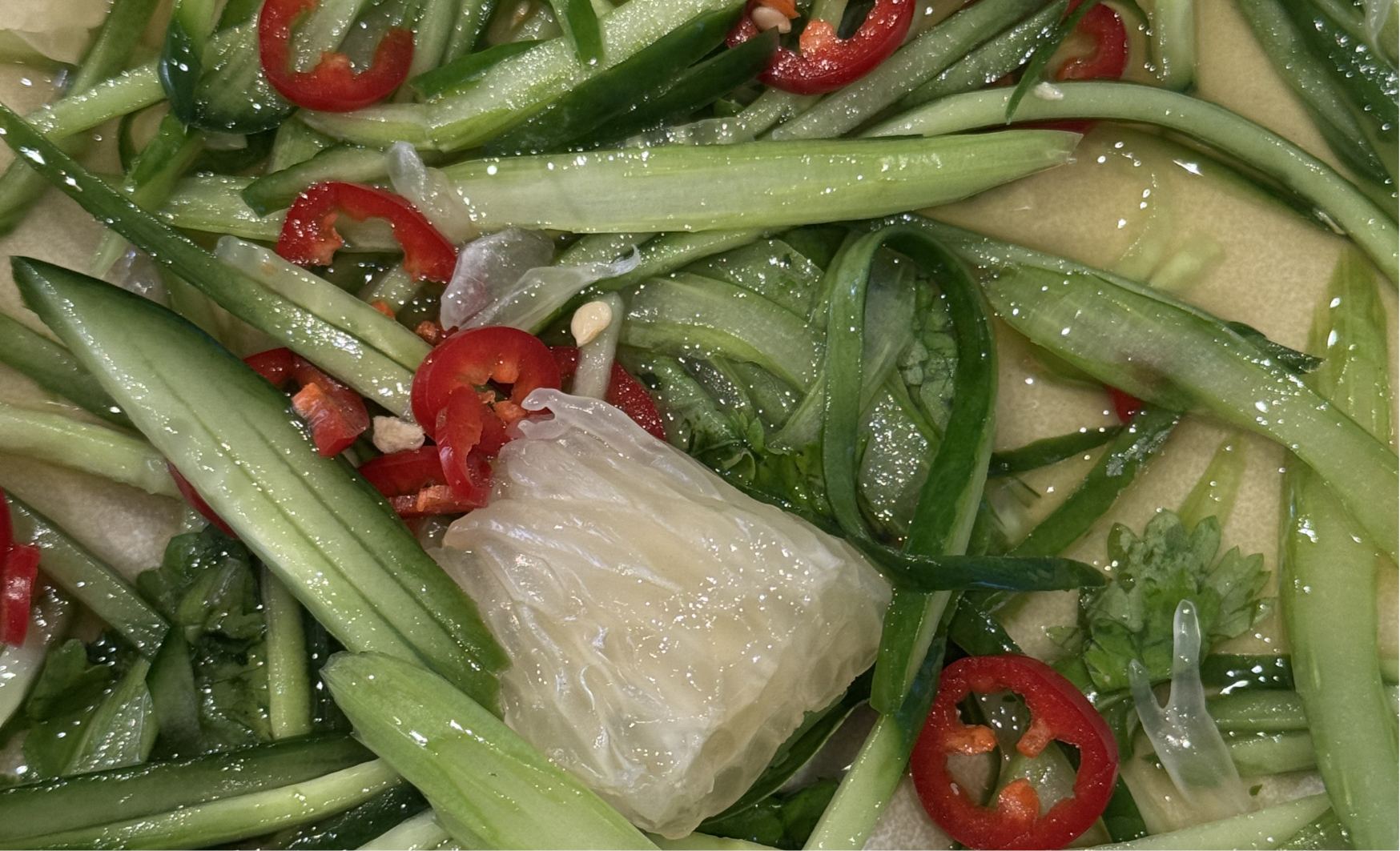 סלט המלפפונים והפומלה הזה עושה בדיוק את זה. יש בו פצפוץ, עסיסיות, חריפות עדינה ורעננות חיה, יחד עם מחווה אחרונה ויפה לסוף עונת ההדרים. מנה ראשונה קלילה אבל מלאה בנוכחות, שמביאה אל הצלחת טעמים מתוקים, חמצמצים וחריפים, ונשענת על איזון מדויק בין חומרי גלם טובים לטיפול מדויק ופשוט.