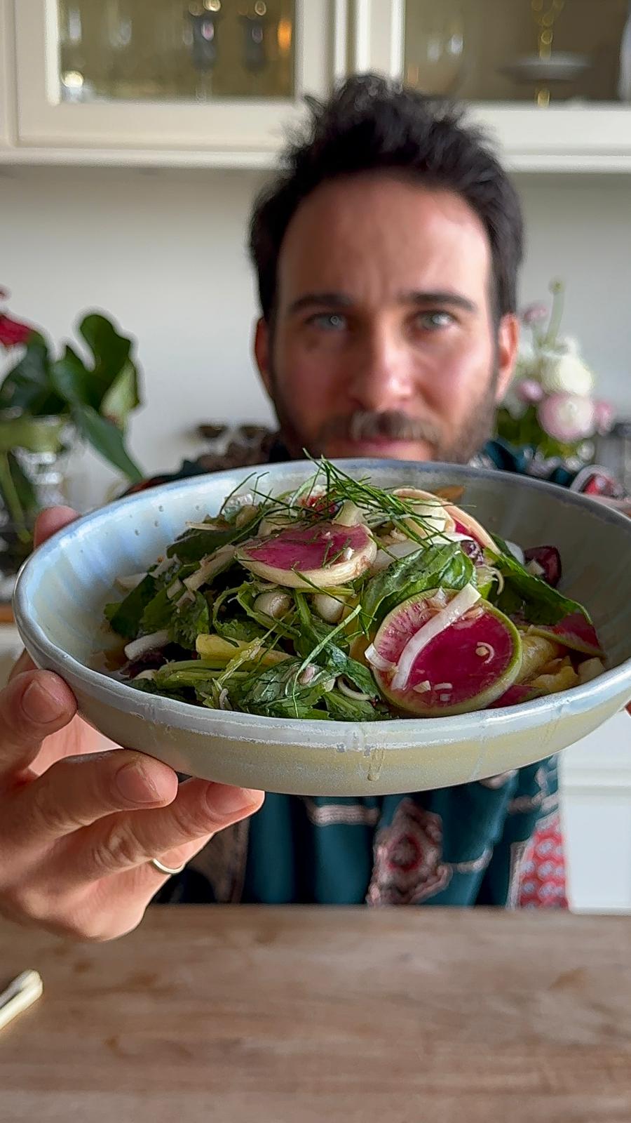 מוסיפים צנון אבטיח, דייקון ולמון גראס וכותשים בעדינות – לא סלט עייף, סלט ער.